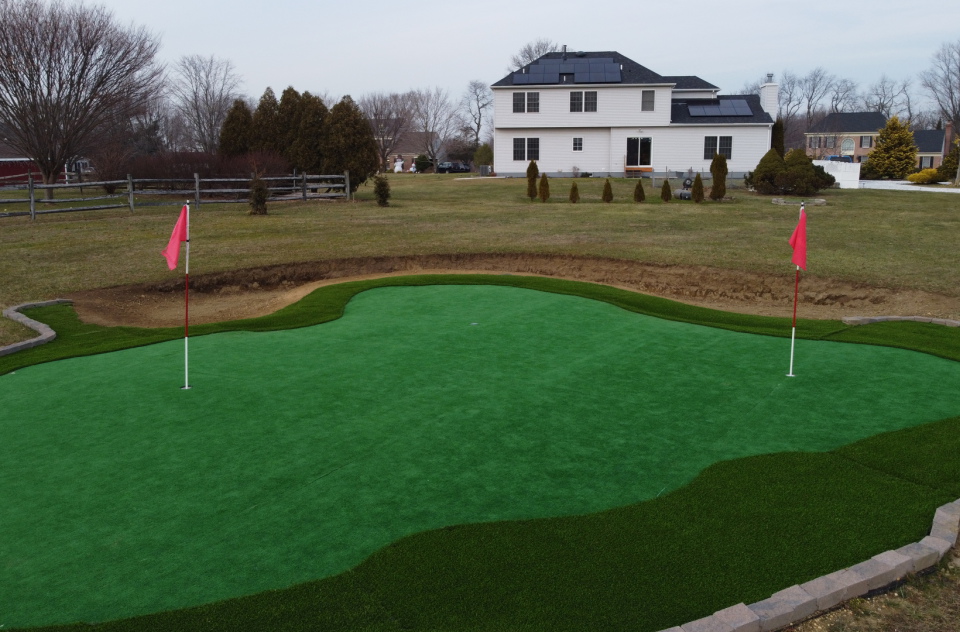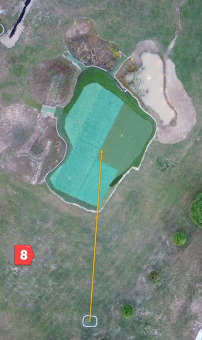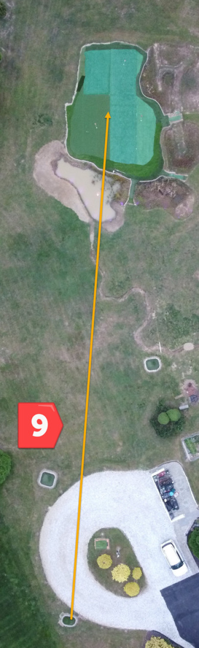 There is one central green with multiple pin positions, and 9 different tee boxes. The course is played with reduced flight Almost Golf and Go Sports Foam Flight Golf Balls, which travel 1/3 distance of real golf balls. Each par 3 hole is unique and challenging, requiring you to choose wisely from a PW thru 5 iron when teeing off.